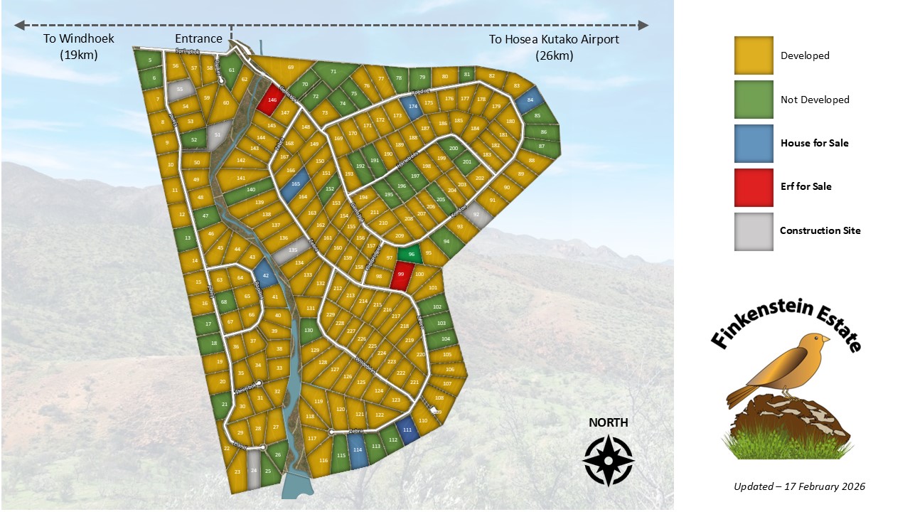 Dear home owners, if you like to list your property please send your best photo and the following information (erf no, erf/house for sale, price, additional information, erf size, levies and contact details) to info@finkenstein.org